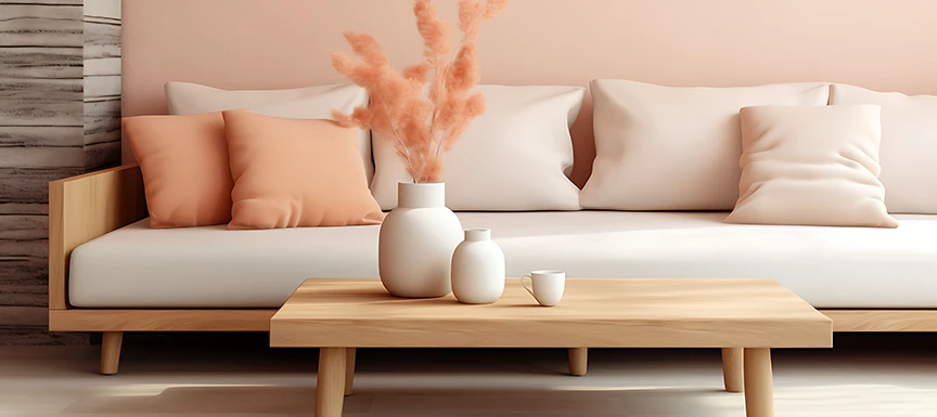 Blush pink conveys delicate femininity, intensifying the dreamlike qualities of cosy peach fuzz splendidly when combined. Like fairytale princesses, this pairing channels grace and innocence simultaneously. Pastel blush pink upholstery, lampshades, artwork, or floral arrangements feel fanciful against peach wall hues. Inversely, peach can take the spotlight on bedding or furnishings grounded by blush pink carpeting.