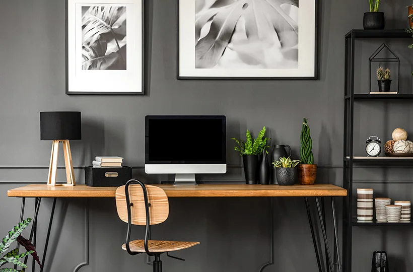 You can go with simple and minimal decor in your room, which will give a spacious look to the room. You can get a good quality wooden table with a drawer attachment. Add a wooden yet comfortable chair and a lamp. You can choose dark wall colour for the study room to add pop to the room. Do not add any other elements like rug, bed, or frames to give a clutter-free look to the room.